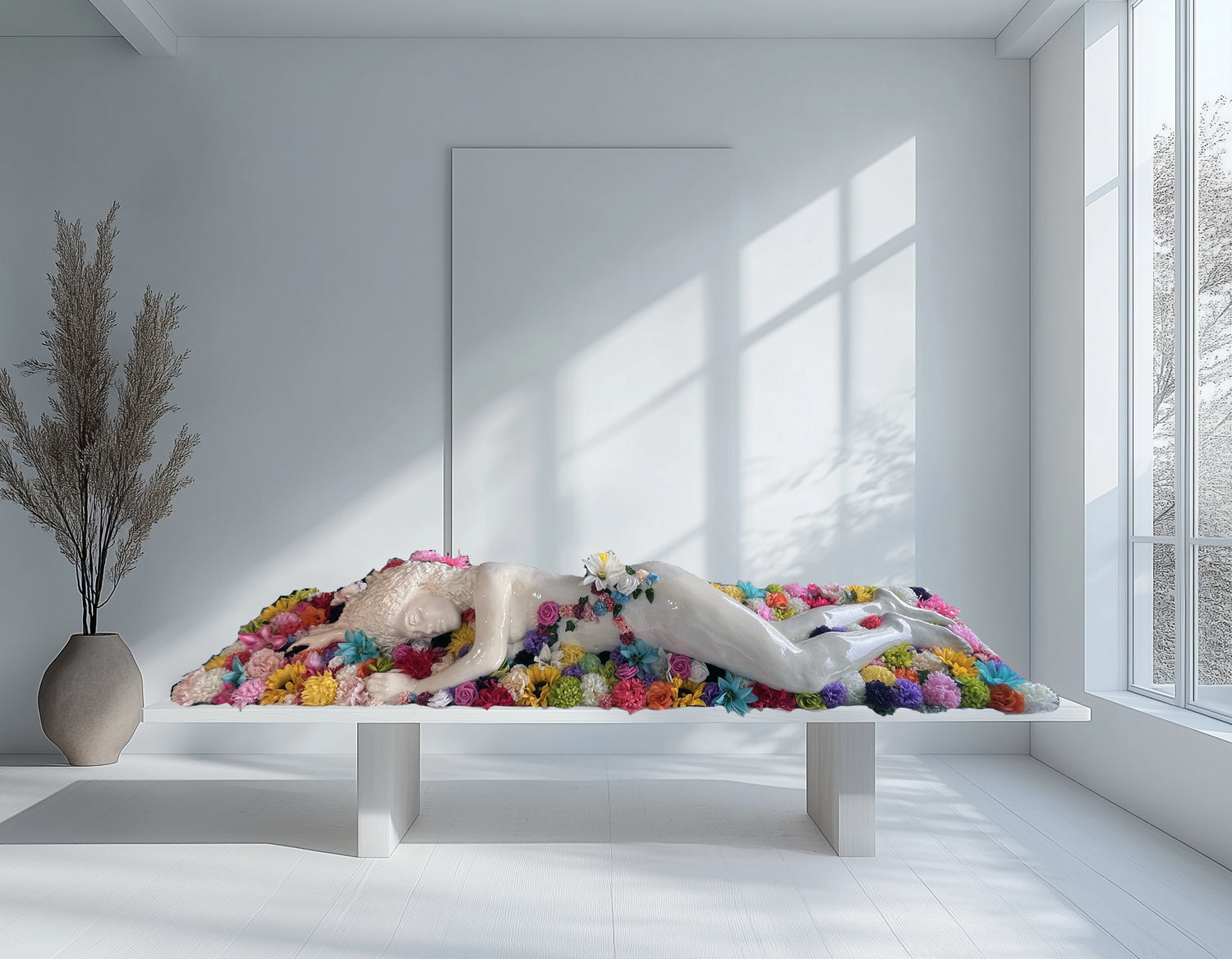 Full-body, lifelike sculpture crafted from plaster, clay, and resin, depicting a woman resting gently on a bed of intricately handpainted resin flowers.